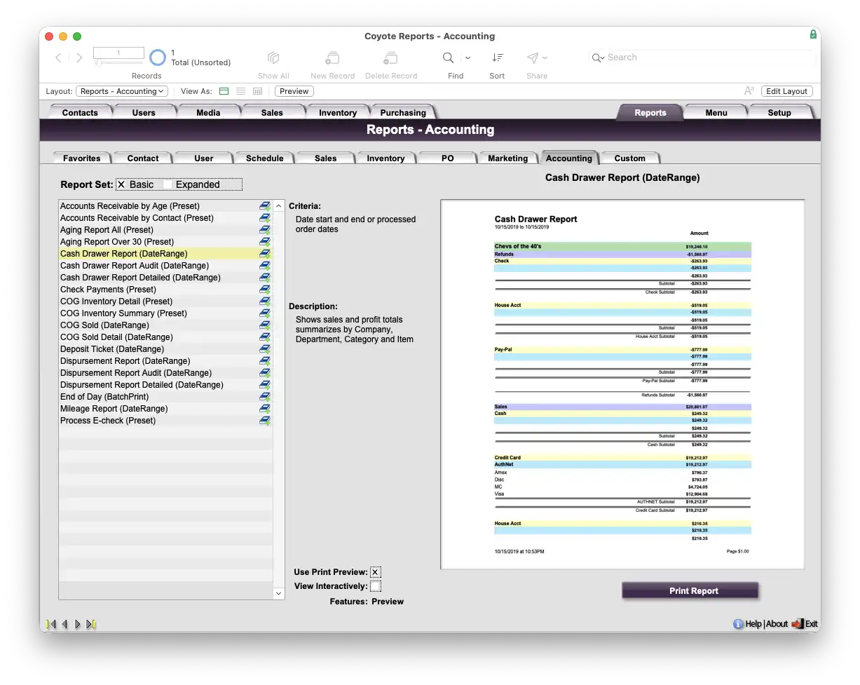 Coyote includes all the fields and relationships you need to keep track of your accounting information including posting batch accounting, tracking shipping charges and pricing, invoice totals and relationships to orders and much more. Naturally you are able to setup separate account information for shipping, cost-of-goods, dropshiments, refunds, returns, invoicing and others. Coyote includes all standard--and some non-standard--payment types and associated account setup.